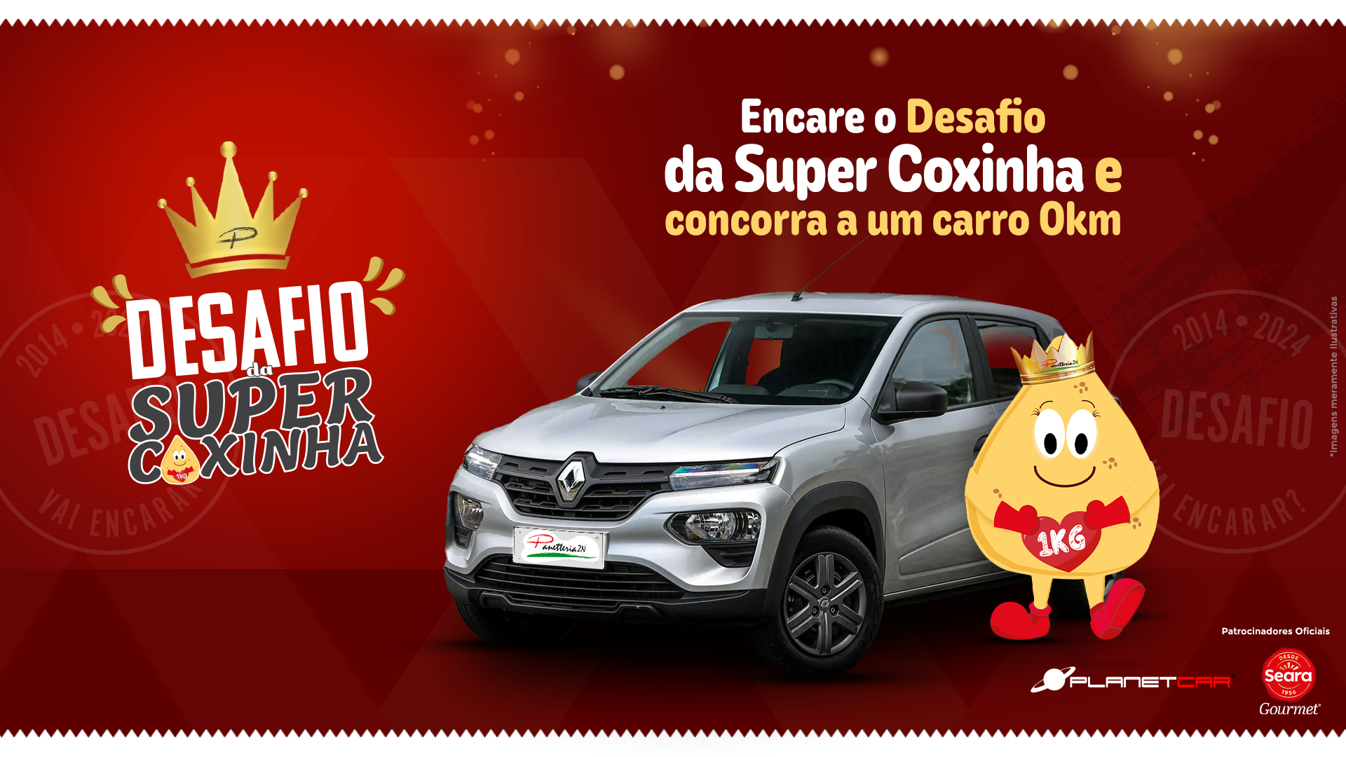 Temos uma premiação vigente. Para esta campanha, o sabor é a SUPER COXINHA GOURMET: Mortadela Defumada Seara, Rúcula, Cream Cheese, Azeitonas Pretas e Cebola Roxa. (Não será permitido outro sabor para o desafio). O desafiante que comer a SUPER COXINHA GOURMET em até 10 minutos, ganha 10 (dez) cupons para concorrer ao sorteio do CARRO RENAULT KWID 24 0KM (Cor Prata) e NÃO PAGA o valor do salgado.